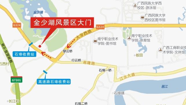 交通路线:在市区内想坐公共汽车抵达金沙湖,可在南宁市火车站附近坐804路公共汽车到金沙湖站下;自驾车的朋友可从江北大道、大学西路或高速路直接前往,离高速路石埠出口仅300米左右,地点在南宁市西乡塘区大学西路尾右拐约300米。